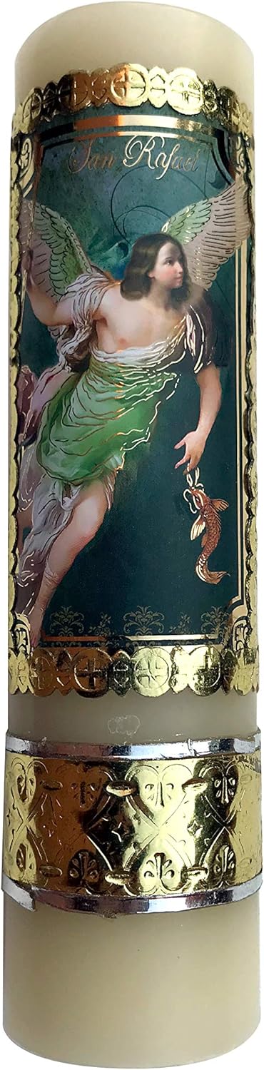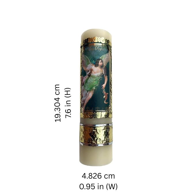 • Each candle is individually hand-poured and adorned with an image of Saint Raphael Candle, using techniques passed down through generations.